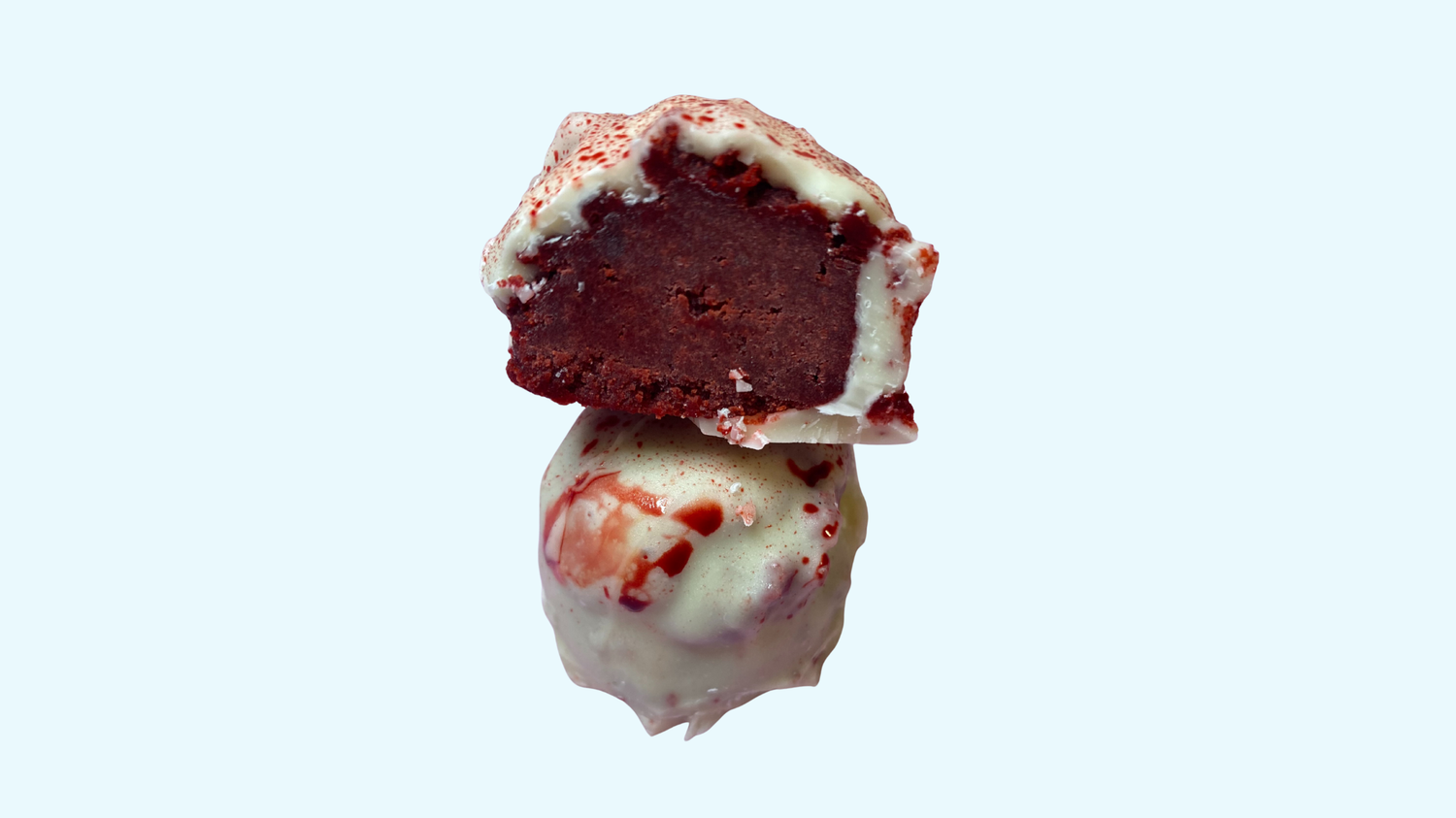 Sink your teeth into our Vampire Brooklyn Ball: red velvet cake blended with cream cheese frosting, dipped in white chocolate, and finished with a haunting edible blood splatter. Rich, dramatic, and dangerously good🩸