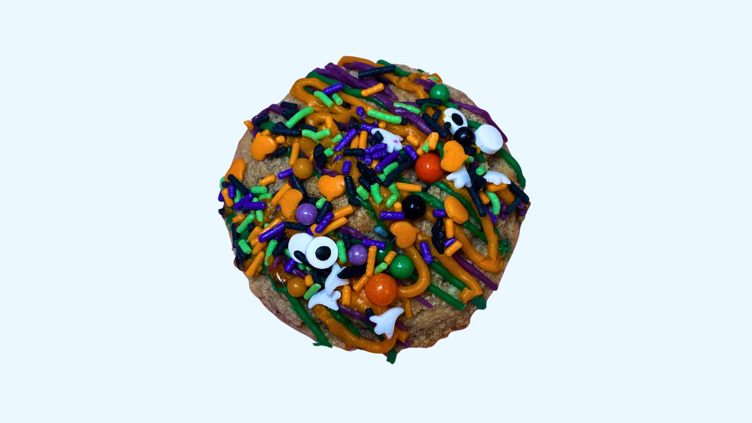 Get ready to jam out with our Monster Mash Cookie! A peanut butter cookie base stuffed with Halloween candy (Reese’s, Kit Kats, Cookies & Cream chocolate, M&Ms, and candy corn) and spooky Oreos, then topped with swirls of purple, green, and orange vanilla buttercream and festive sprinkles. It’s a monster hit 🎃