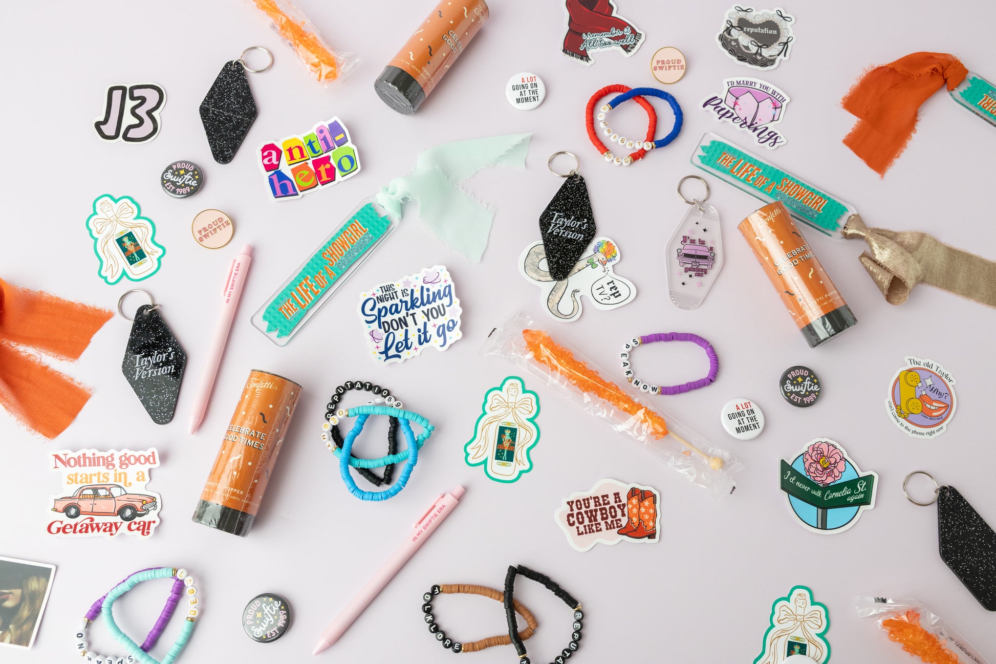 - Large Box: Includes 8 of our cookies, plus everything in the Medium Box and an extra Taylor Swift-themed sticker (3 total), an extra friendship bracelet (2 total), a "13" temporary hand tattoo, an "In My Swiftie Era" pen, a "Taylor’s Version" keychain, an orange Rock Candy, and an orange confetti popper!